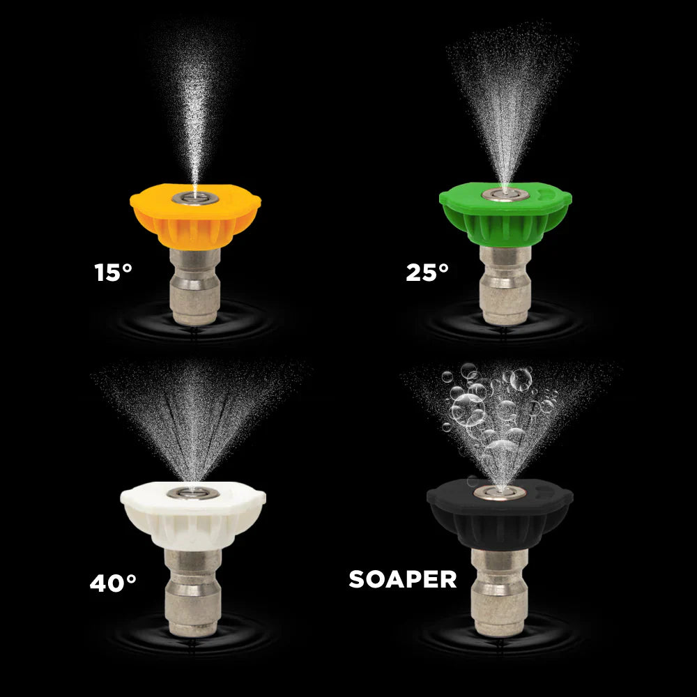 Spray Tips: 4 quick-connect nozzles – 15°, 25°, 40°, and soap