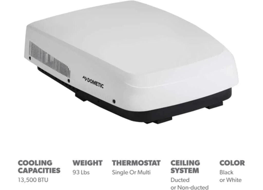 The Dometic FreshJet 5 Low Profile RV Air Conditioner delivers 13,500 BTU of cooling power.