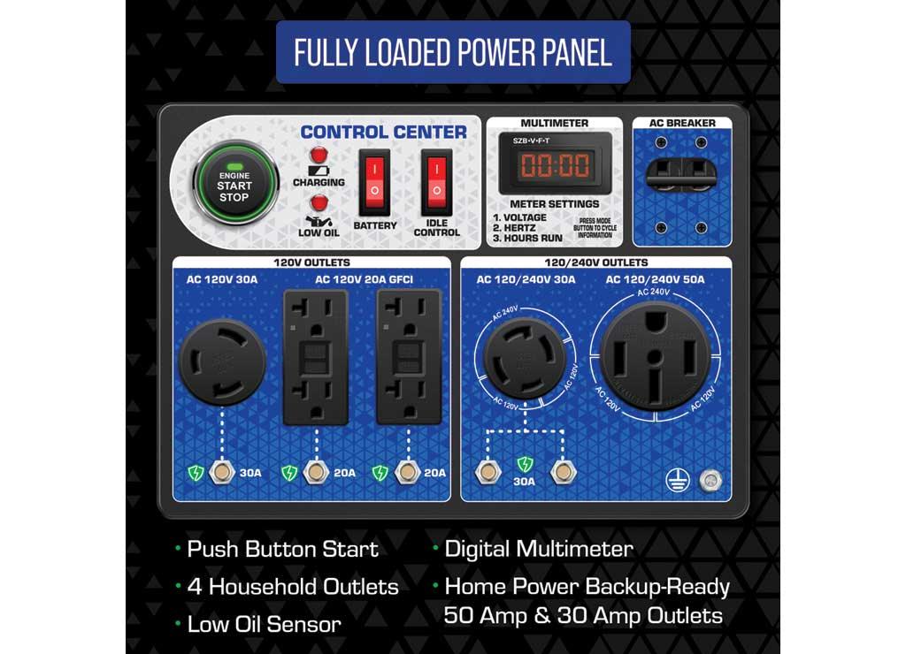 • Full power panel with oil warning light, volt meter, circuit breaker and power outlets