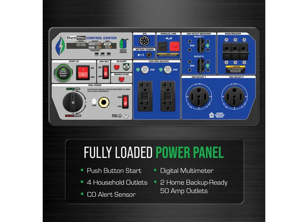 - Home Backup Ready — Equipped with two 50 Amp plugs for use with generator interlocks or transfer switches.